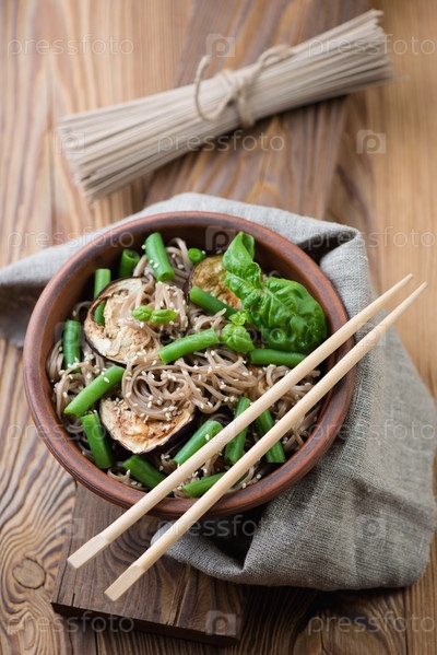 Гречневая соба с баклажанами, зеленой фасолью и кунжутом