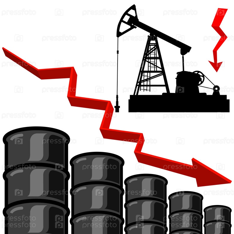 Бочки нефти и красная стрелка, направленная вниз. Векторные иллюстрации