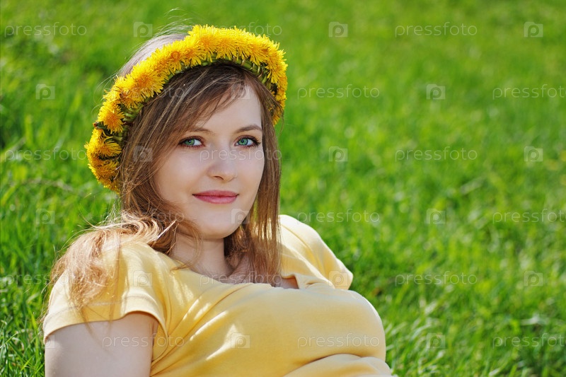 Красивая блондинка в венке из одуванчиков лежит на газоне