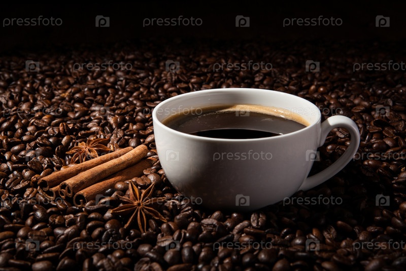 Чашка черного кофе и жареные кофейные зерна