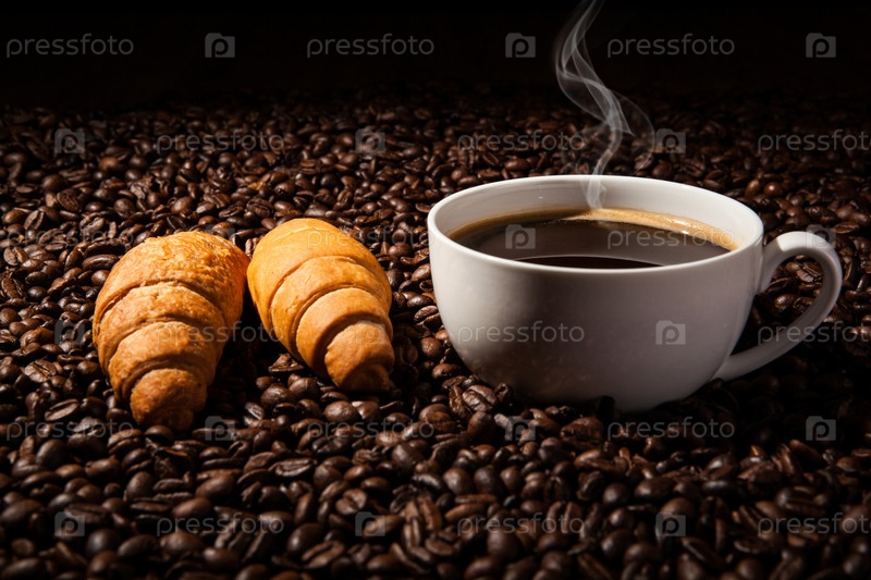 Чашка черного кофе и жареные кофейные зерна