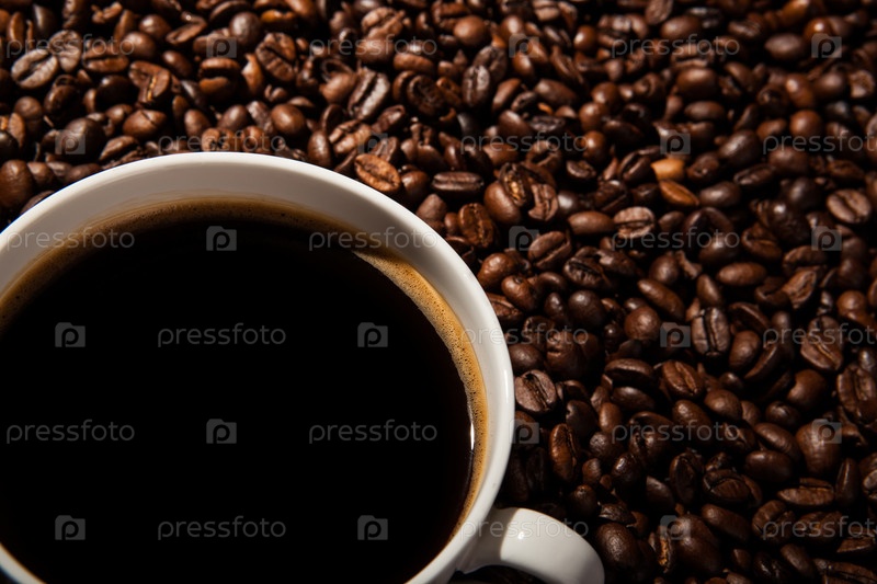 Чашка черного кофе и жареные кофейные зерна