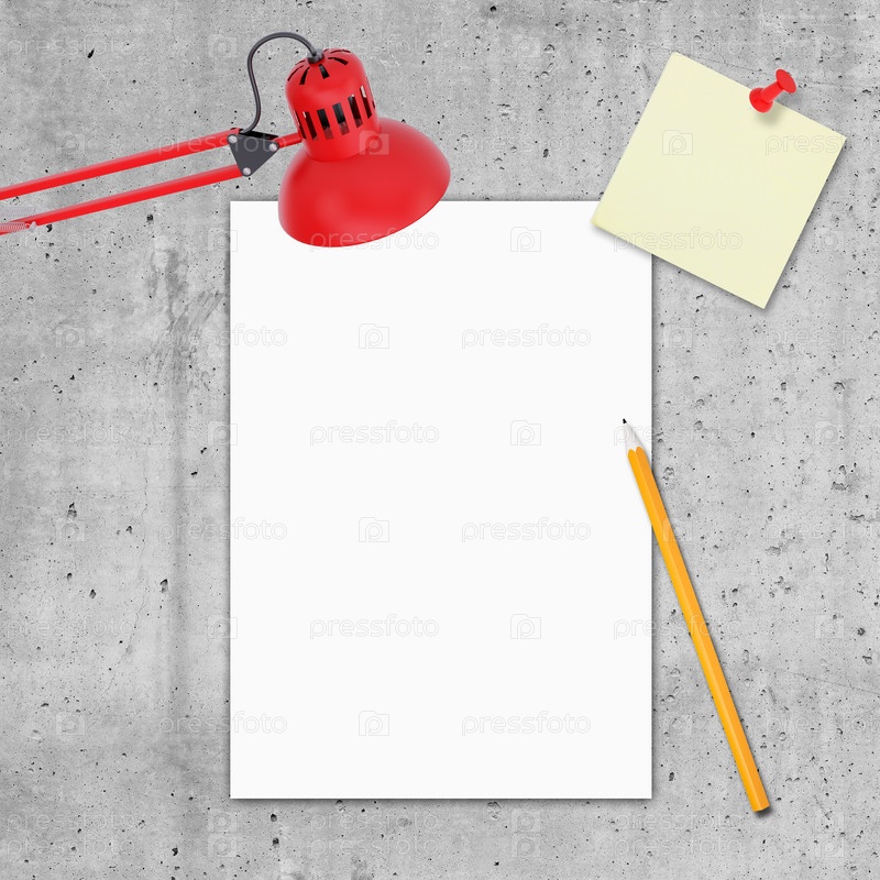 Чистый лист бумаги, карандаш, пустые бланки и настольная лампа