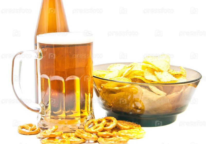 Пиво, крендели и чипсы крупным планом