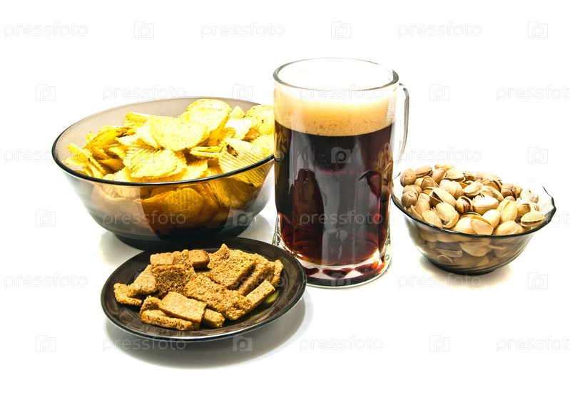 Различные закуски и темное пиво