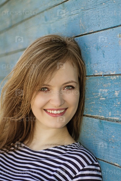 Красивая блондинка в тельняшке на фоне старой синей стены