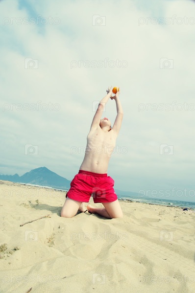Подросток играет в мяч на пляже