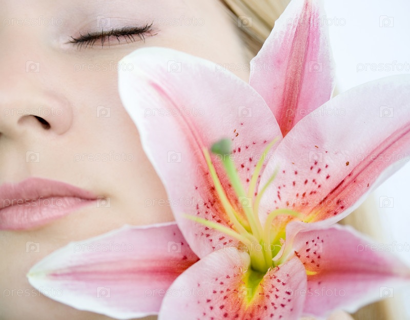 Молодая женщина с цветком лилии крупным планом