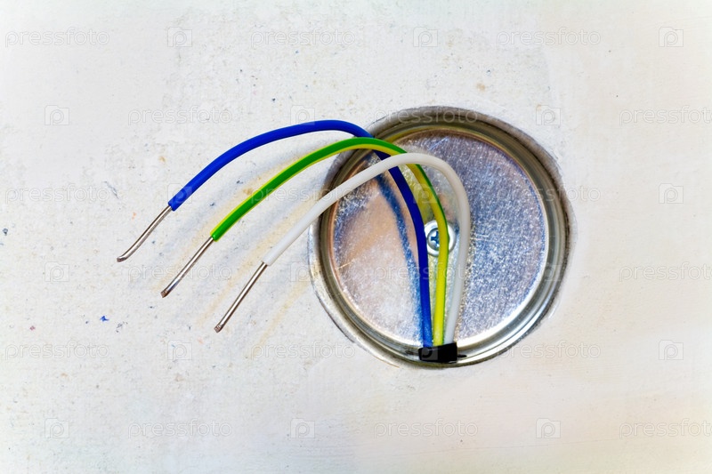 Три провода электрического кабеля и клеммная коробка, расположенная на гипсокартоне