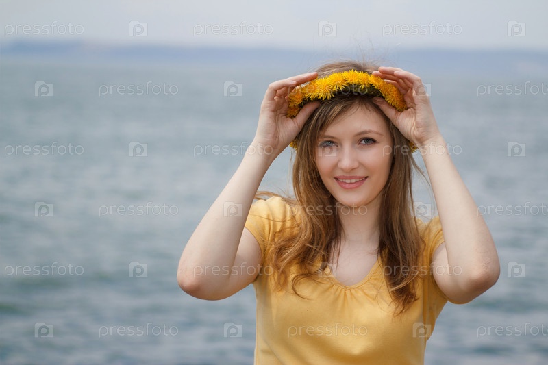 Улыбающаяся светловолосая девушка в венке из одуванчиков