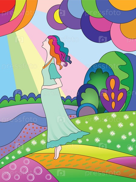 Беременная женщина на лугу. Яркий весенний пейзаж