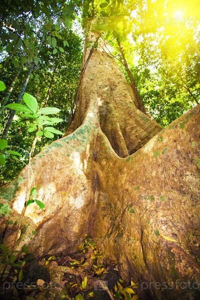 Большое старое дерево в глубине леса в солнечный день