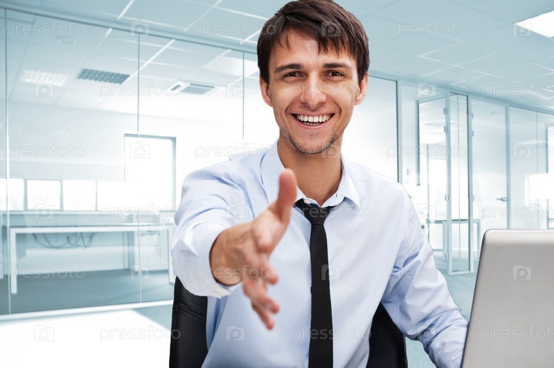 Молодой бизнесмен, сидящий за столом, протягивает руку для рукопожатия