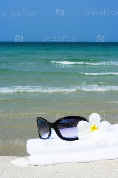 Солнцезащитные очки, цветок и полотенце на пляже