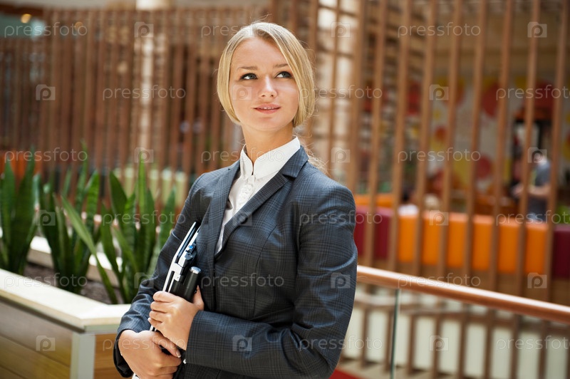 Привлекательная деловая женщина с ноутбуком внутри офисного здания