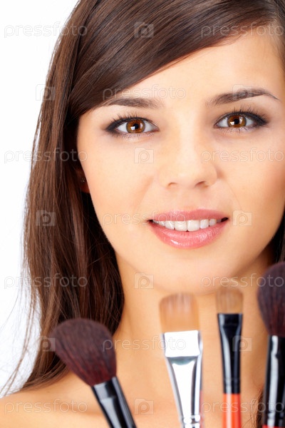 Портрет девушки с профессиональными кистями для макияжа, белый фон