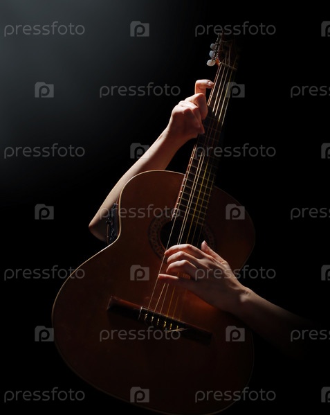 Игра на акустической гитаре, на черном фоне