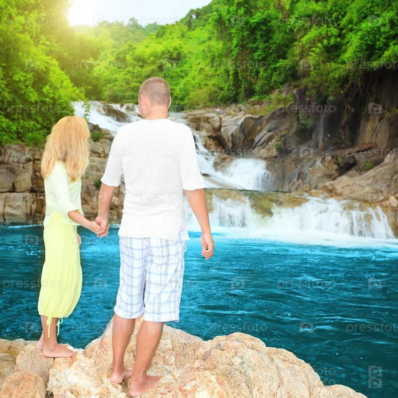 Пара возле водопада на рассвете