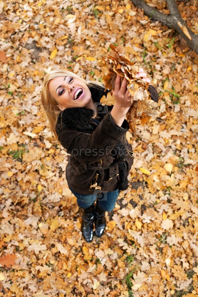 Счастливая женщина бросает осенние листья