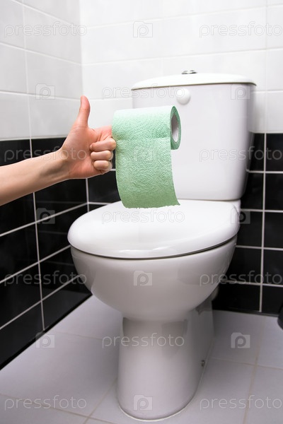 Рука с туалетной бумагой на фоне унитаза
