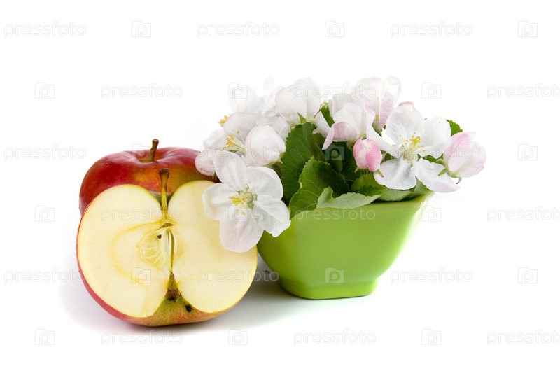 Красное яблоко и цветы яблони на белом фоне