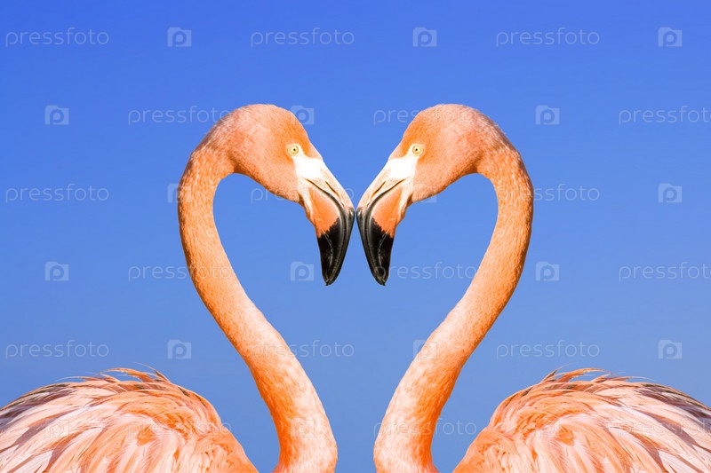 Два розовых фламинго образуют сердце на фоне голубого неба