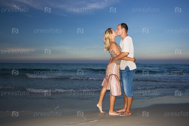 Молодая пара целуется на берегу моря