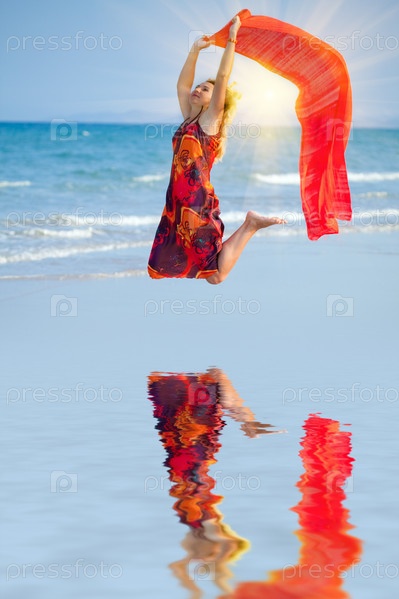 Женщина в красном прыгает на берегу океана
