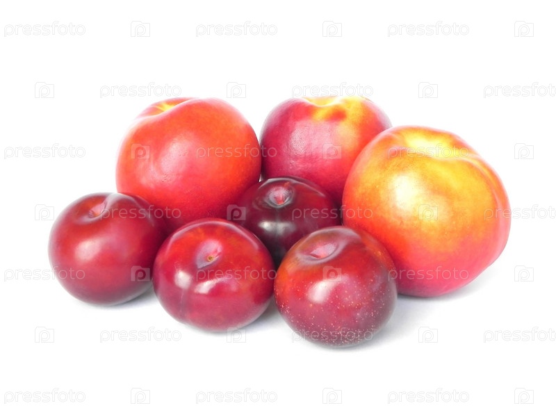 Спелые сливы и персики на белом фоне