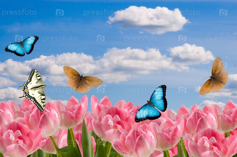 Композиция из весенних цветов и бабочек на фоне облачного неба