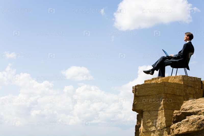 Изображение задумчивого бизнесмена, сидящего на вершине горы с ноутбуком и смотрящего в небо