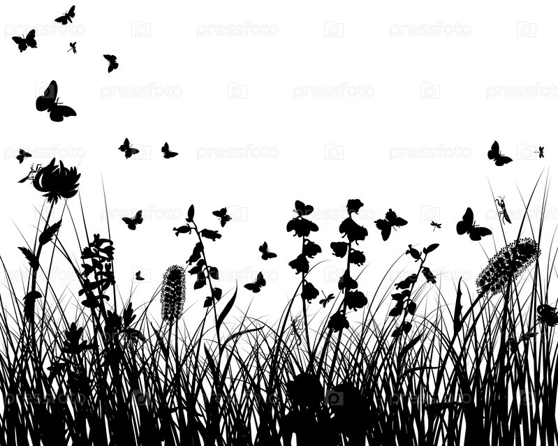 Векторный фон с травой, цветами и бабочками