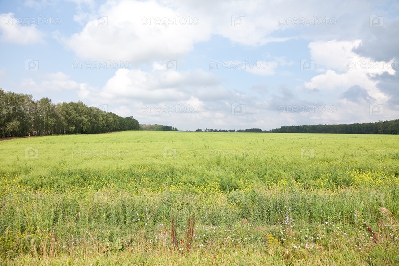 Зеленое поле под облачным небом