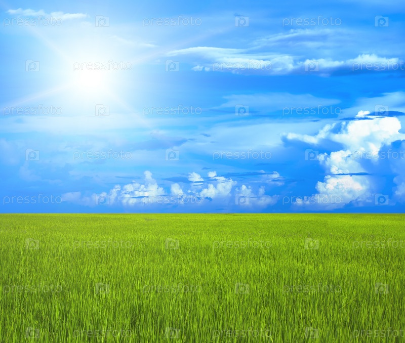 Зеленое поле на фоне синего неба с облаками