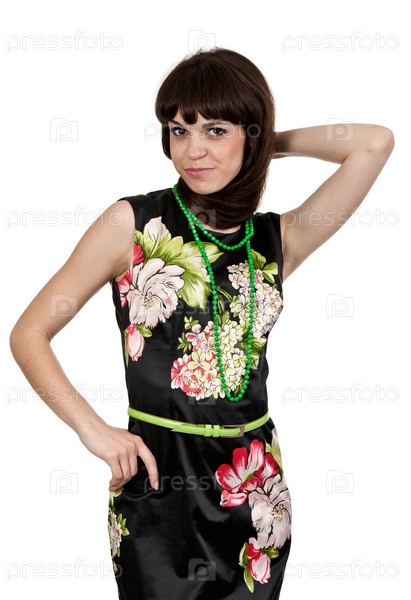 Женщина в черном шелковом платье с цветочным узором на белом фоне