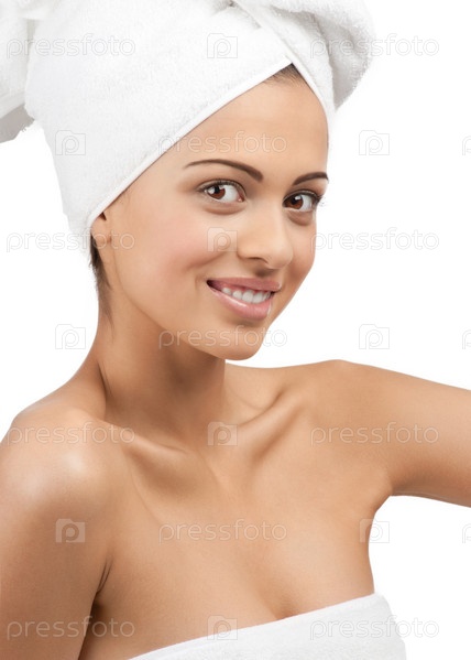 Девушка с белым полотенцем на голове. Изолировано на белом фоне