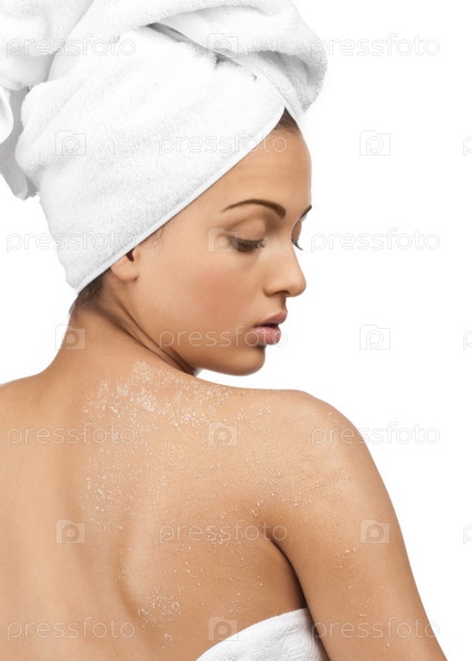 Девушка с белым полотенцем на голове применяет скраб для тела. Изолировано на белом фоне