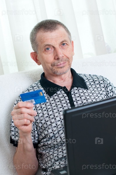 Пожилой мужчина расплачивается с помощью кредитной карты, работая дома на ноутбуке