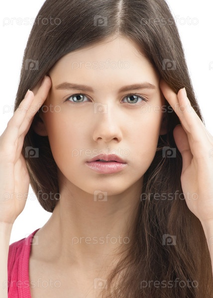 Портрет молодой красивой женщины с головной болью, на белом фоне