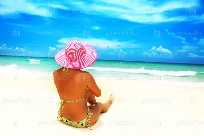 Женщина в розовый шляпе загорает на пляже