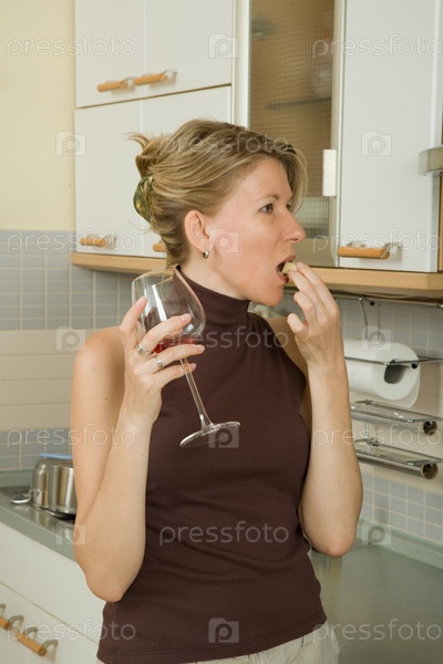 Женщина с бокалом вина на кухне