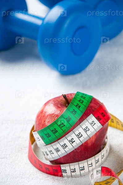 Красное яблоко с сантиметровой лентой на фоне гантелей. Концепция здорового питания