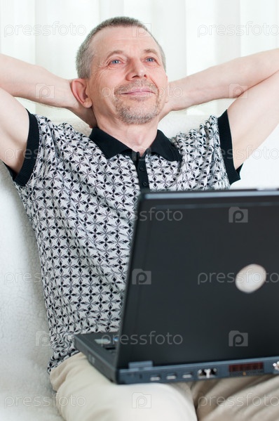 Пожилой мужчина отдыхает в гостиной перед ноутбуком