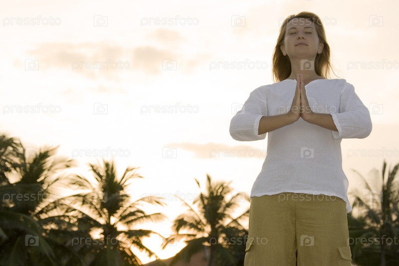 Молодая женщина медитирует на закате