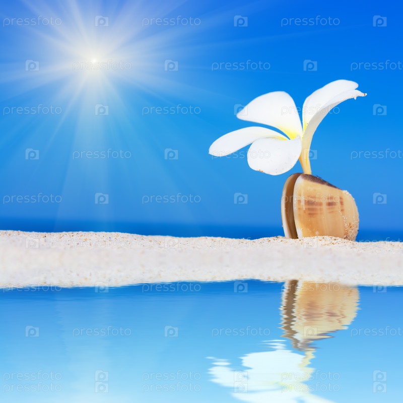 Тропический цветок плюмерии (Plumeria alba) и раковина на песчаном пляже