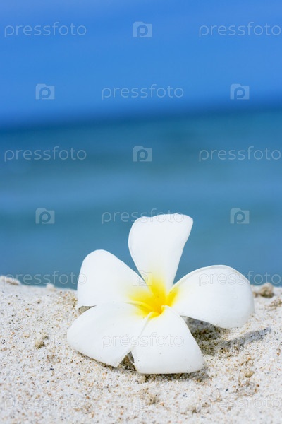 Тропический цветок плюмерии (Plumeria alba) на песчаном пляже