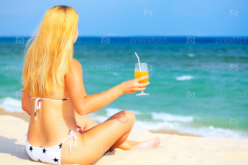 Молодая женщина на тропическом пляже с бокалом сока