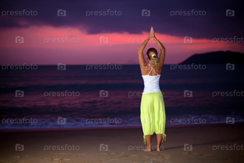Молодая женщина занимается йогой на берегу океана на рассвете