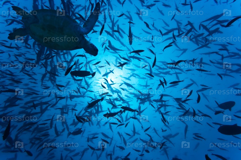 Стайка рыбок и черепаха под водой на фоне солнечного света
