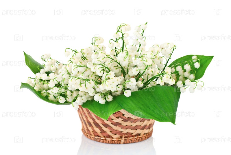 Букет ландышей в корзине на белом фоне
